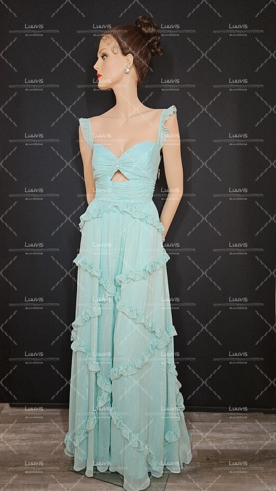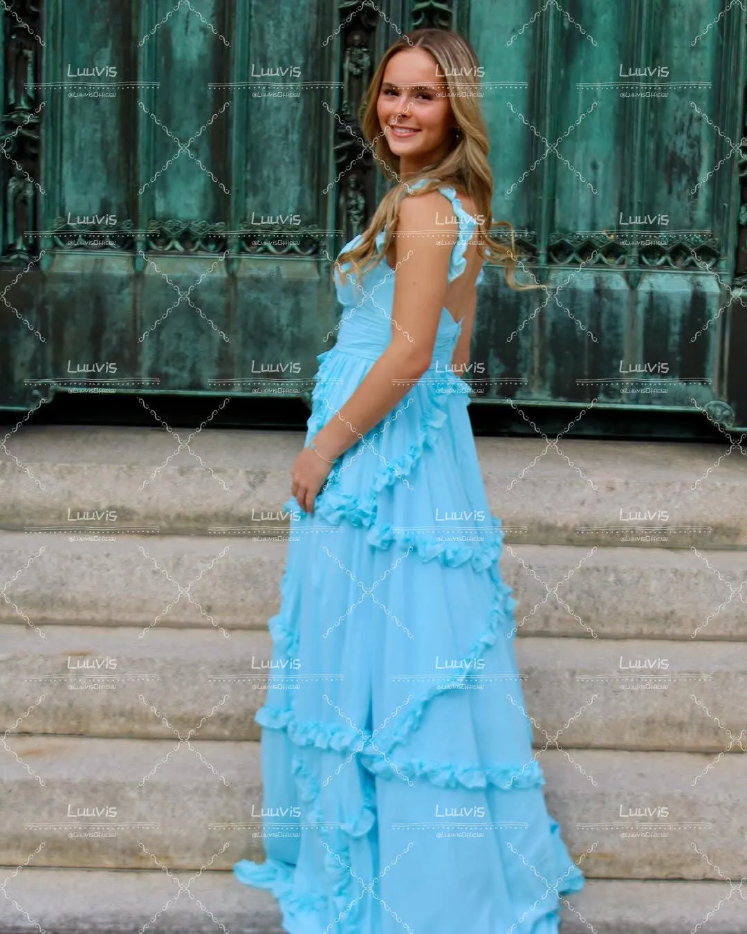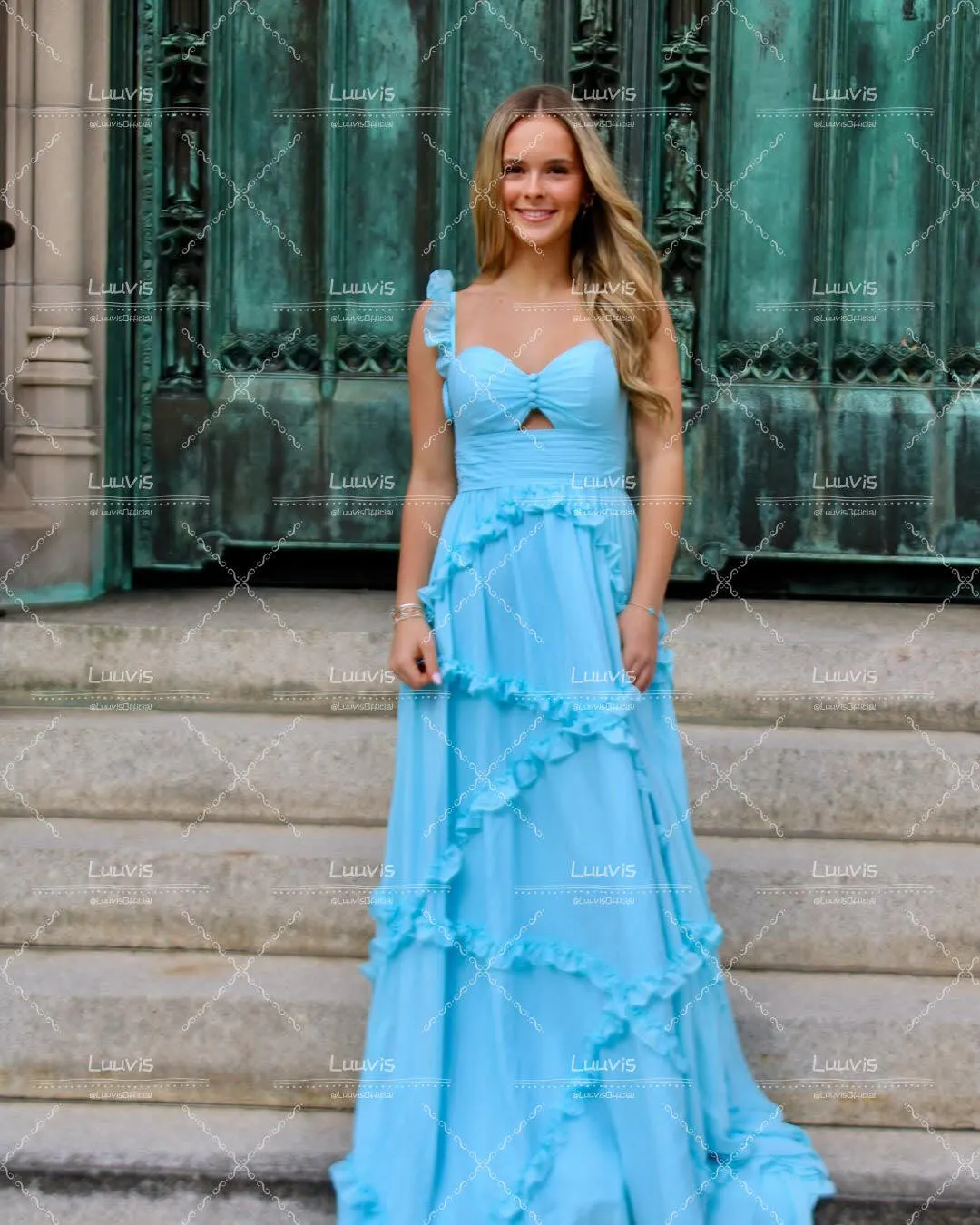 Charming A Line Sweetheart Blue Long Prom Dress with Ruffles
