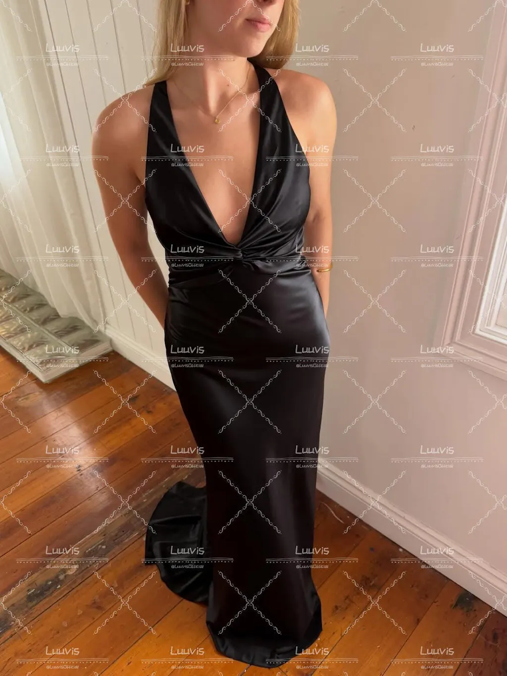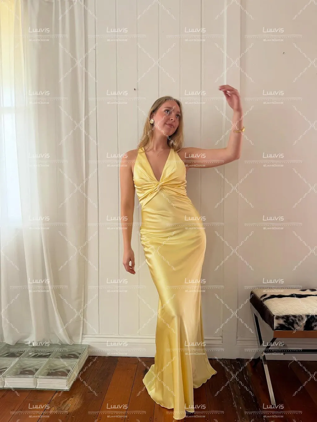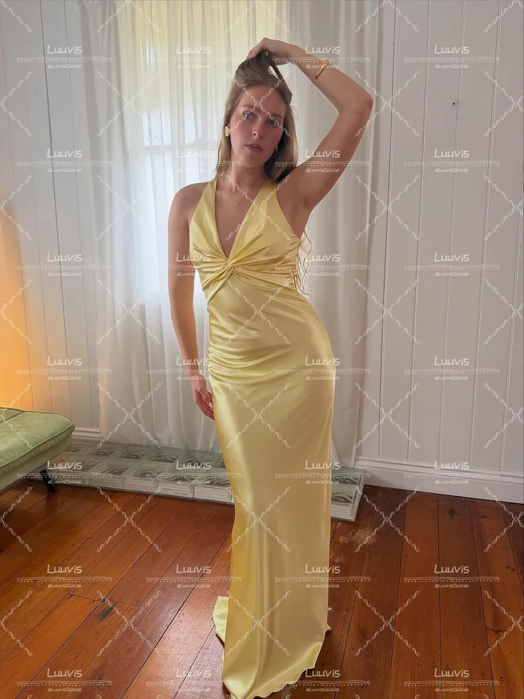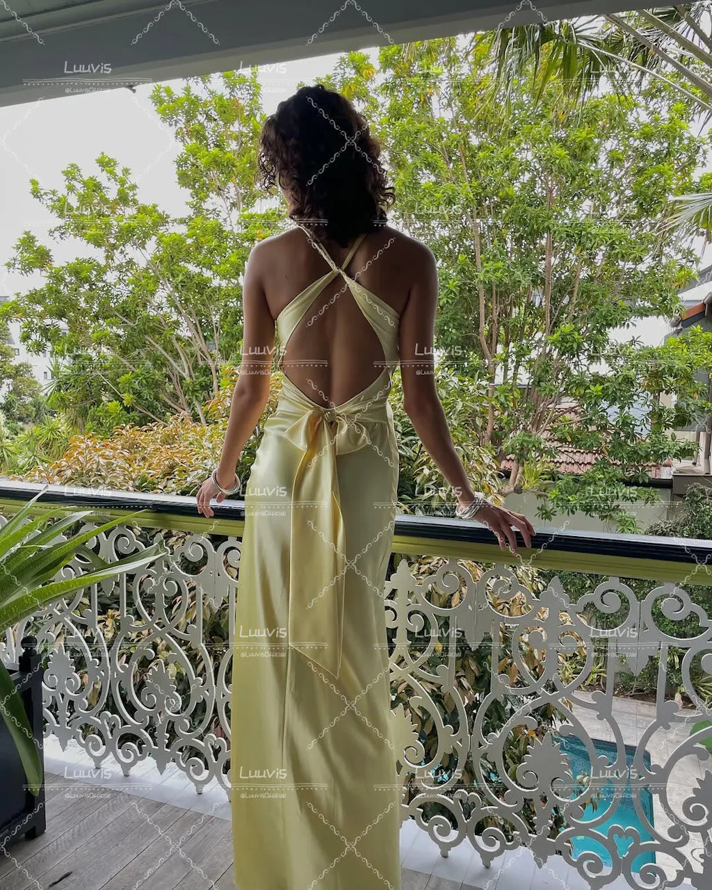 Chic Sheath Halter Neck Yellow Long Party Dress with Backless Bowknot