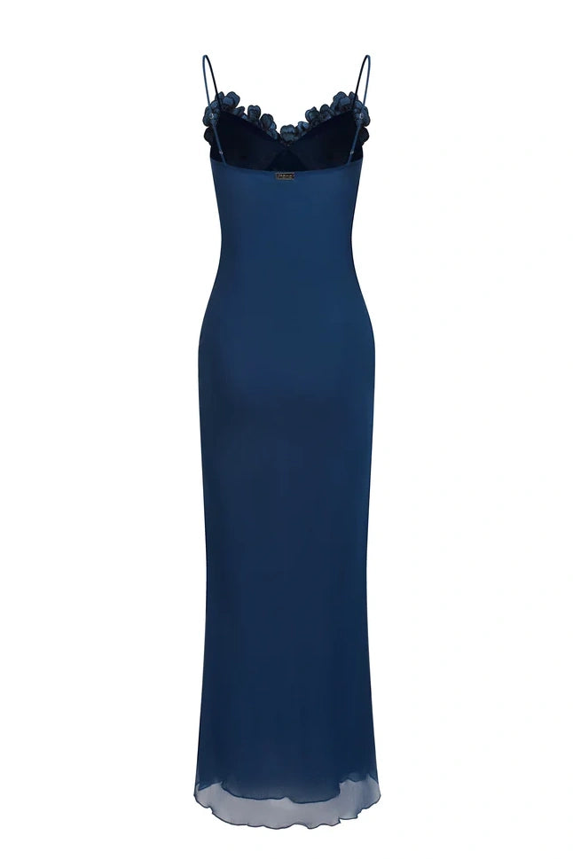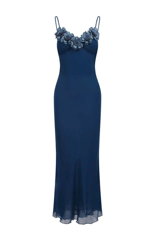 Chic Sheath Spaghetti Straps Navy Blue Long Party Dress with Flowers