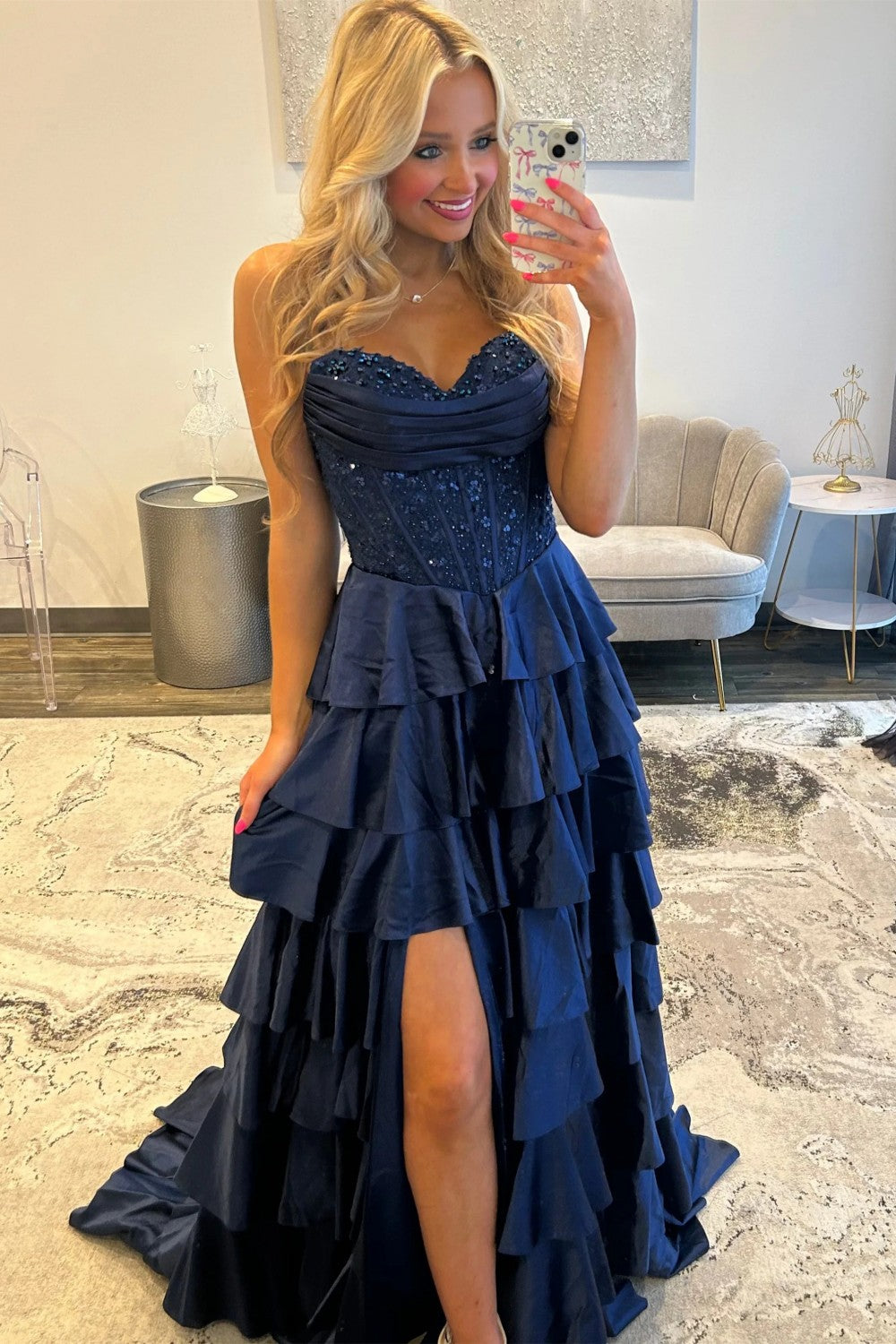 Classic A Line Sweetheart Navy Corset Prom Dress with Appliques Ruffles