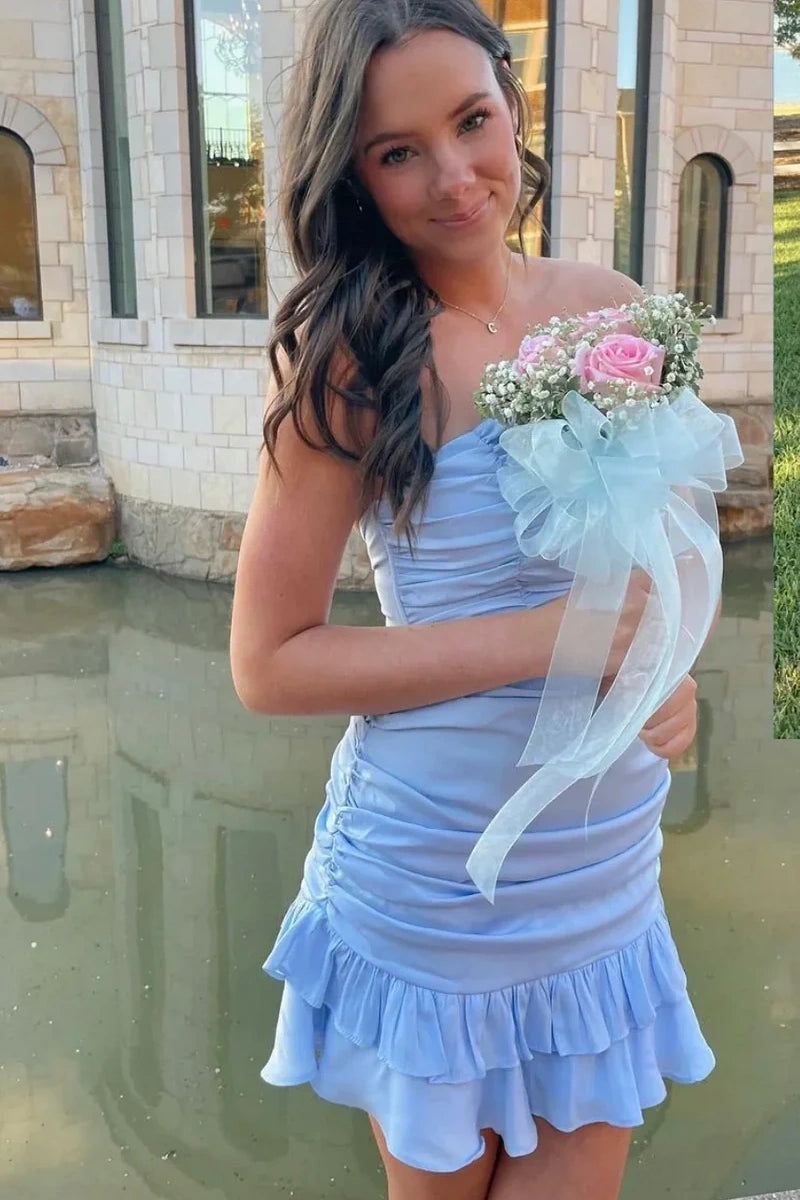 Cute Sheath Strapless Light Blue Short Homecoming Dress with Ruffles