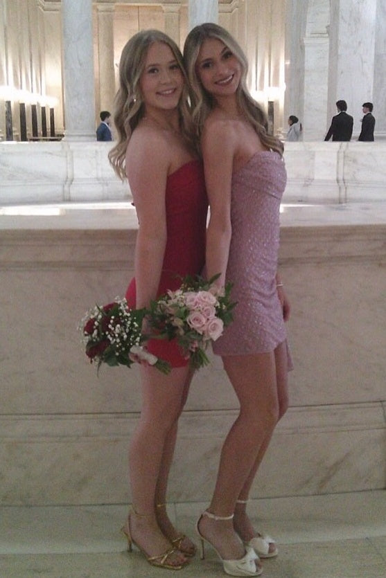 Cute Sheath Strapless Pink Short Homecoming Dress with Ruffles