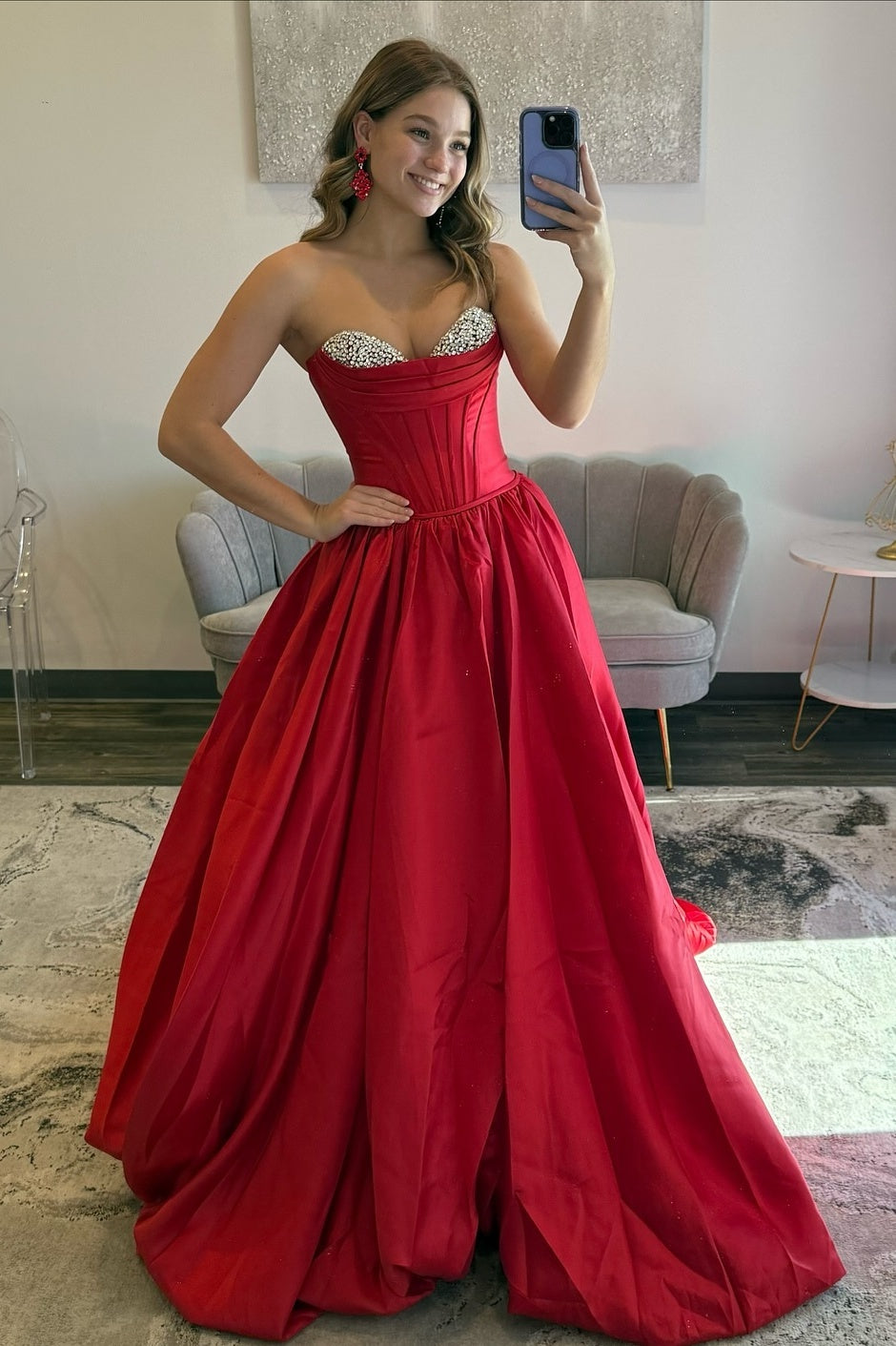 Elegant A Line Sweetheart Red Corset Prom Dress with Beading