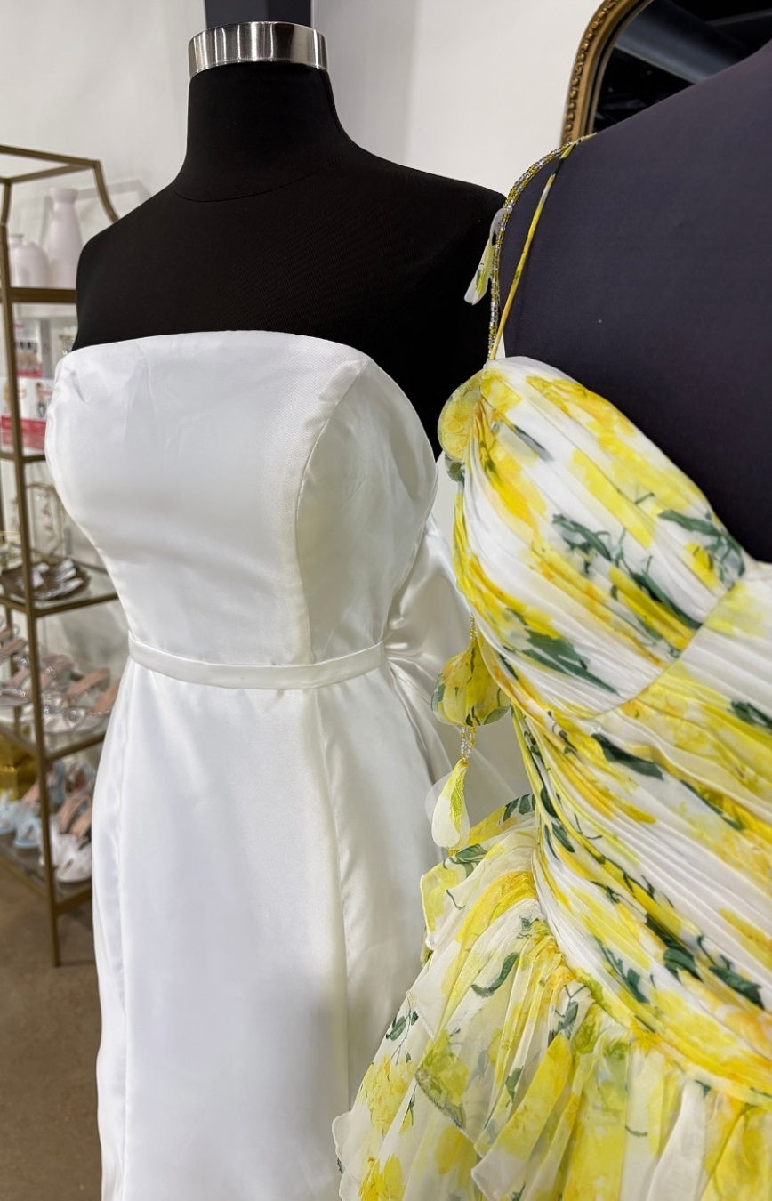 Gorgeous A Line Spaghetti Straps Yellow Floral Printed Long Prom Dress with Ruffles