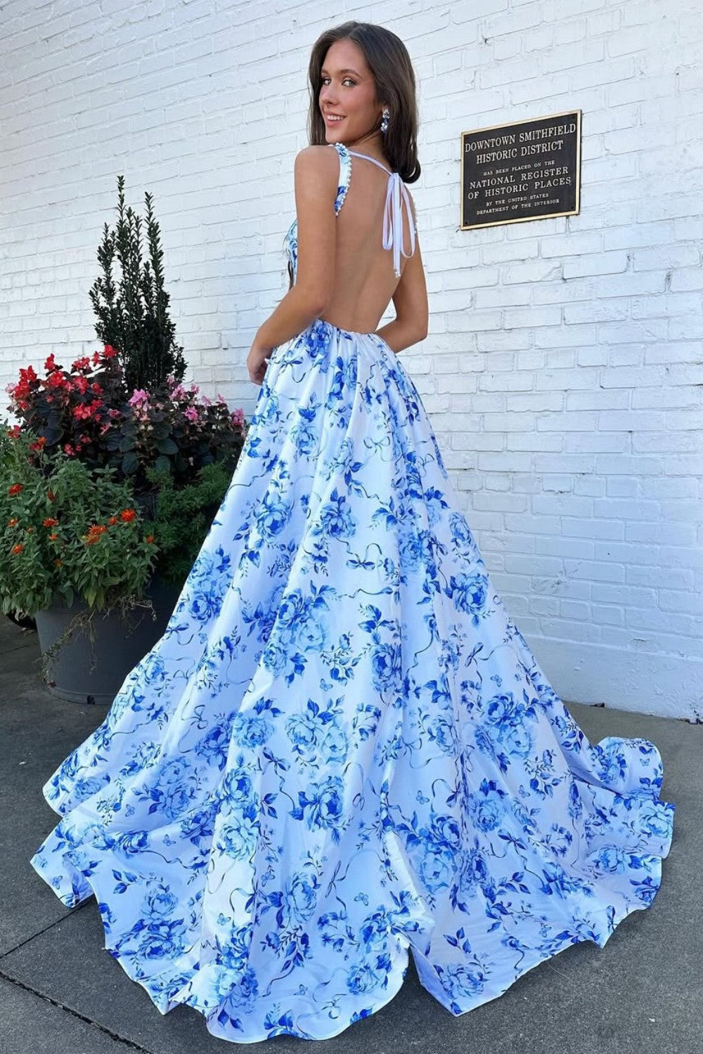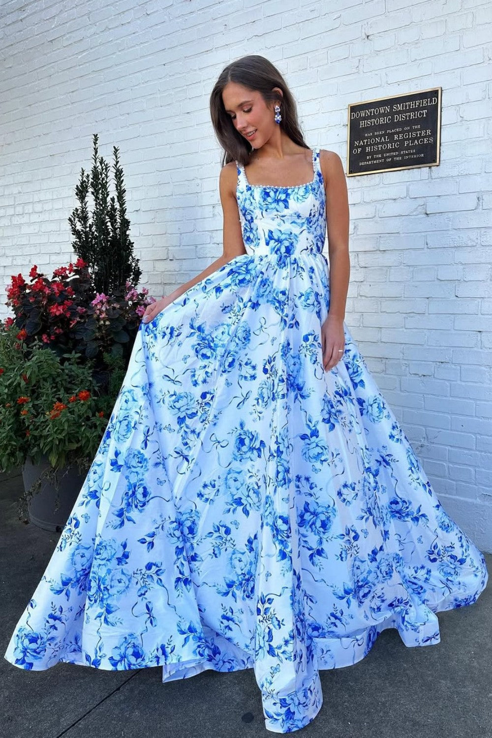 Gorgeous A Line Square Neck Blue Floral Printed Long Prom Dress with Backless