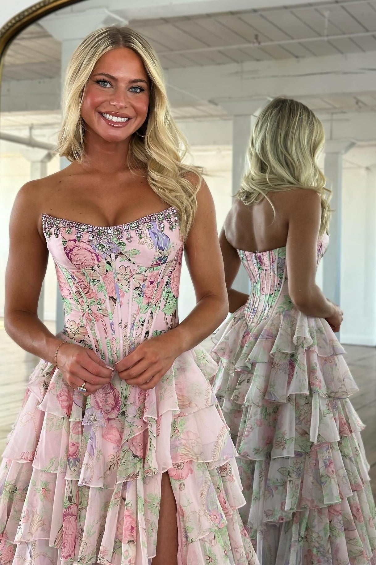 Gorgeous A Line Strapless Yellow Printed Corset Prom Dress with Beading Ruffles