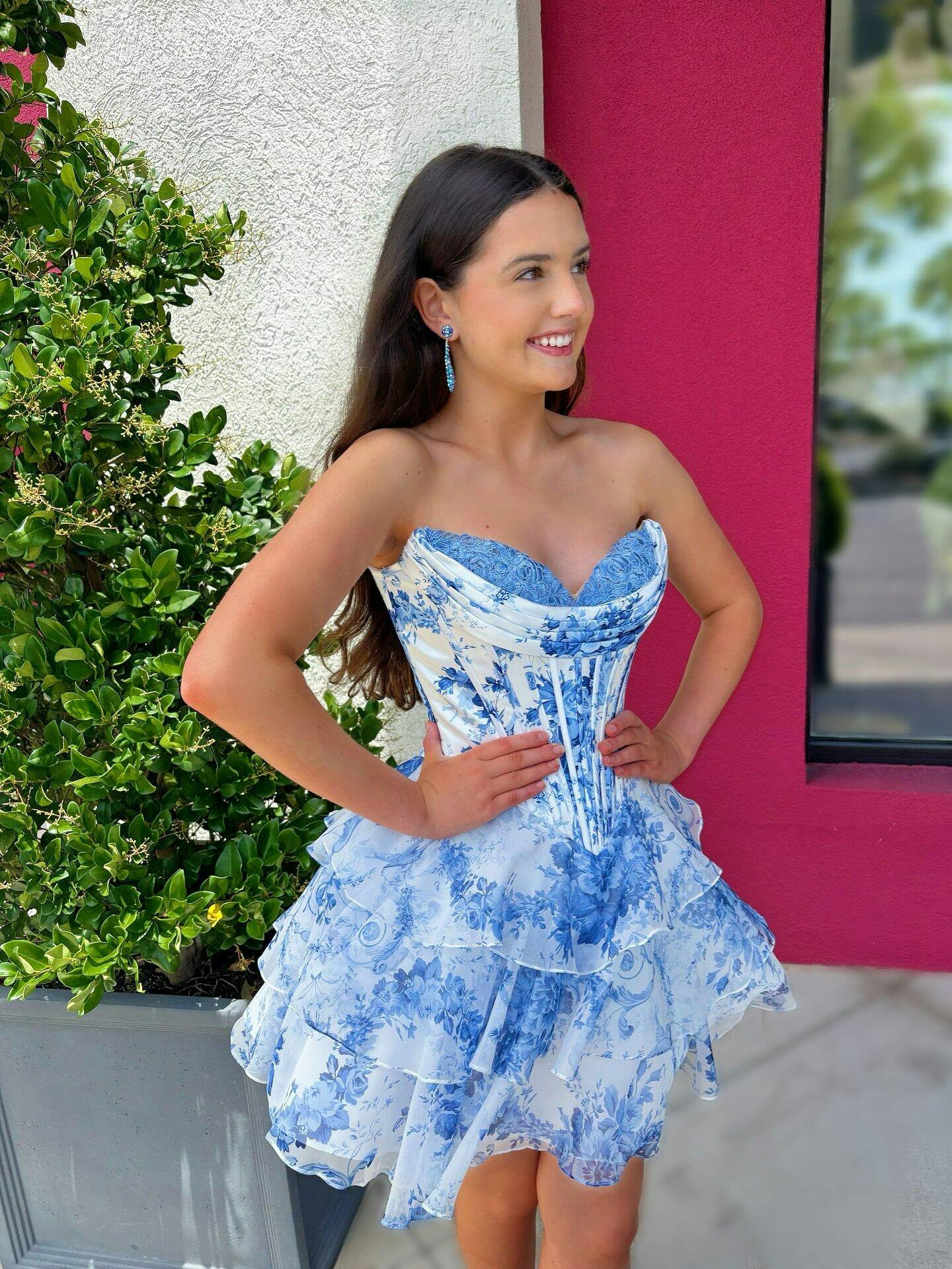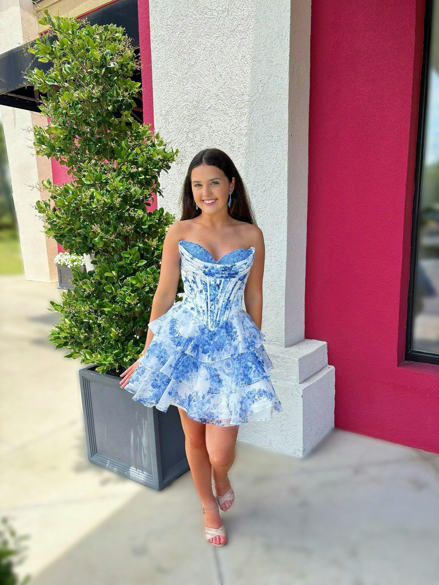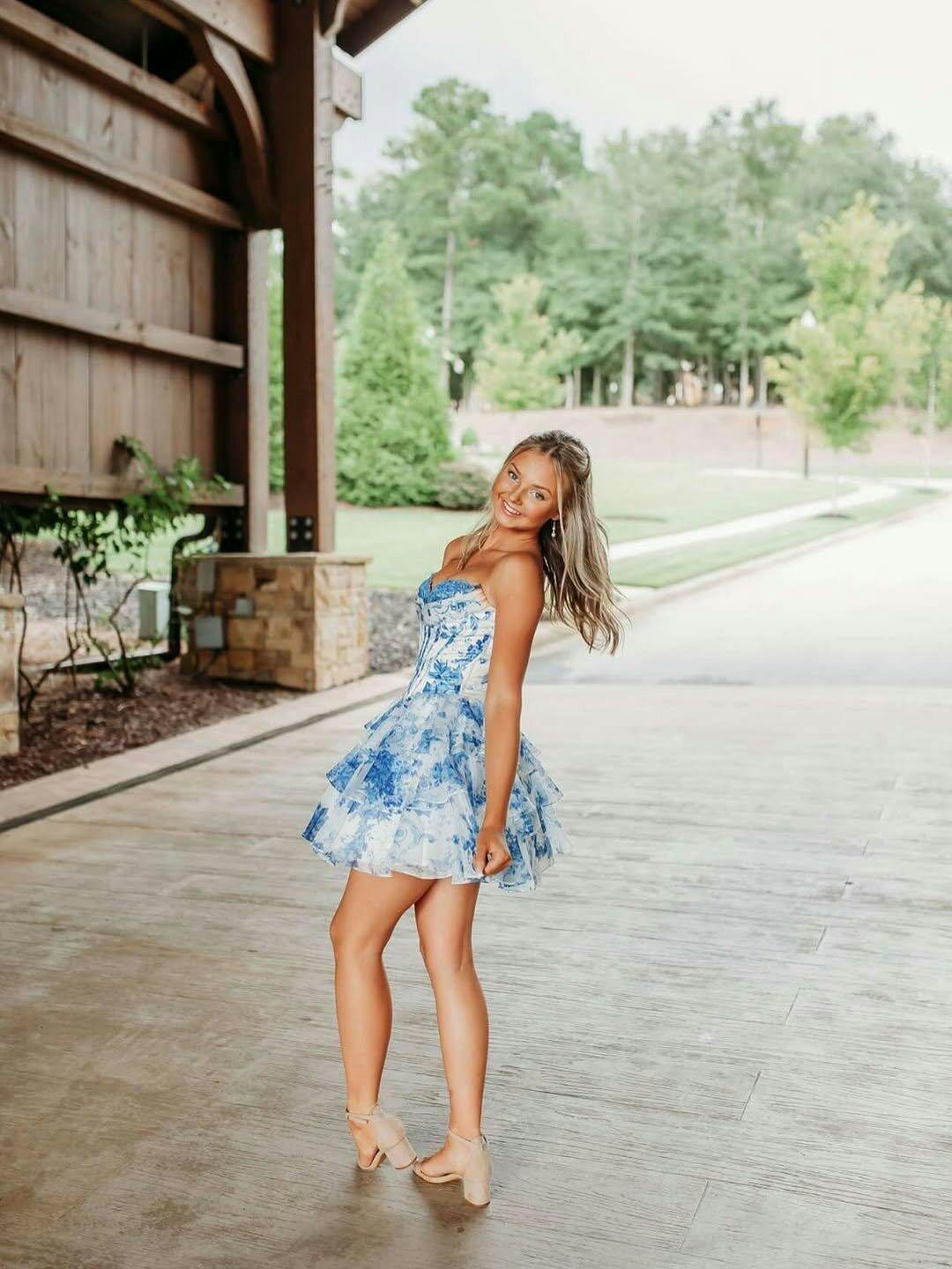 Gorgeous A Line Sweetheart Blue Printed Short Homecoming Dress with Ruffles
