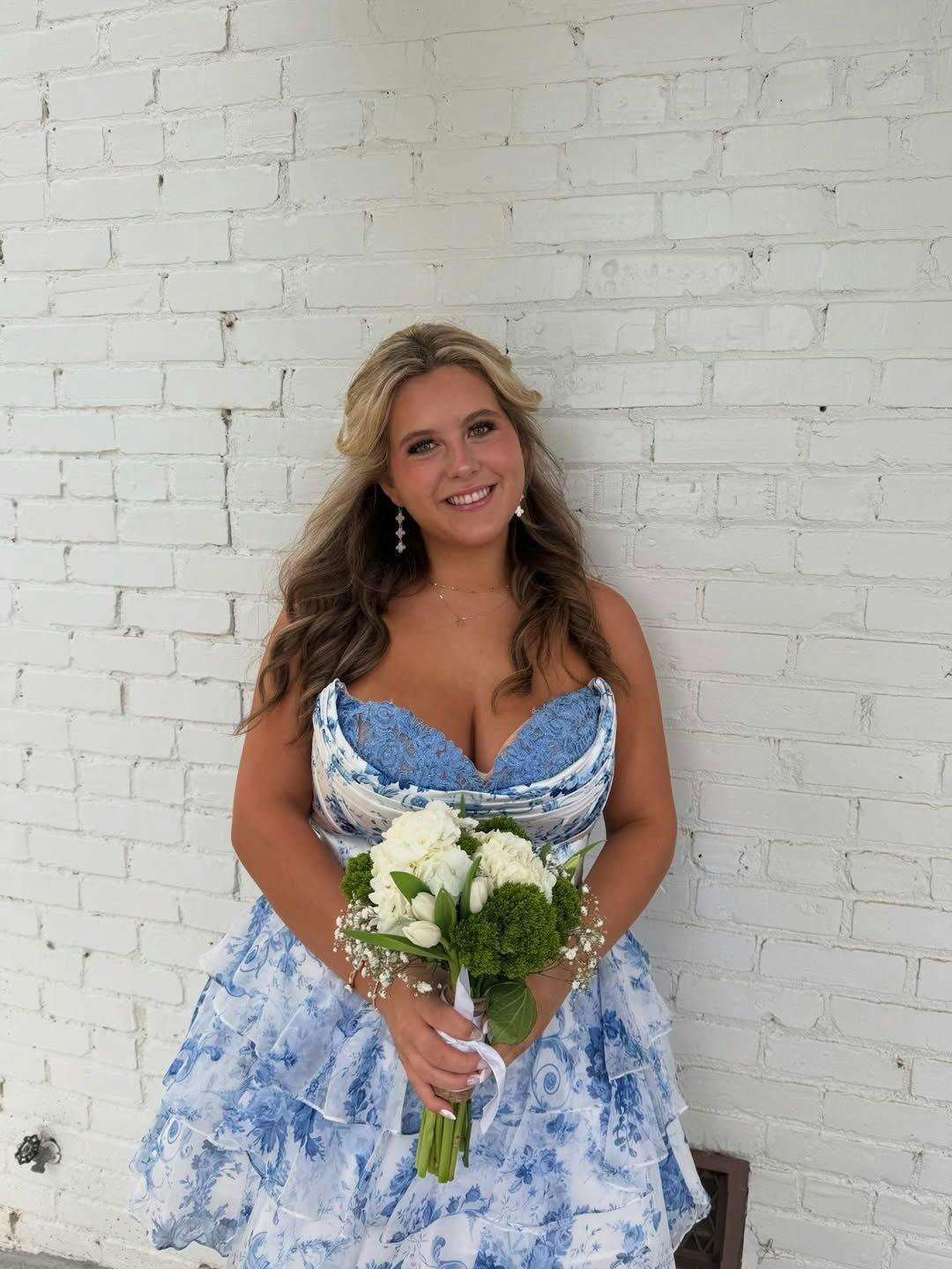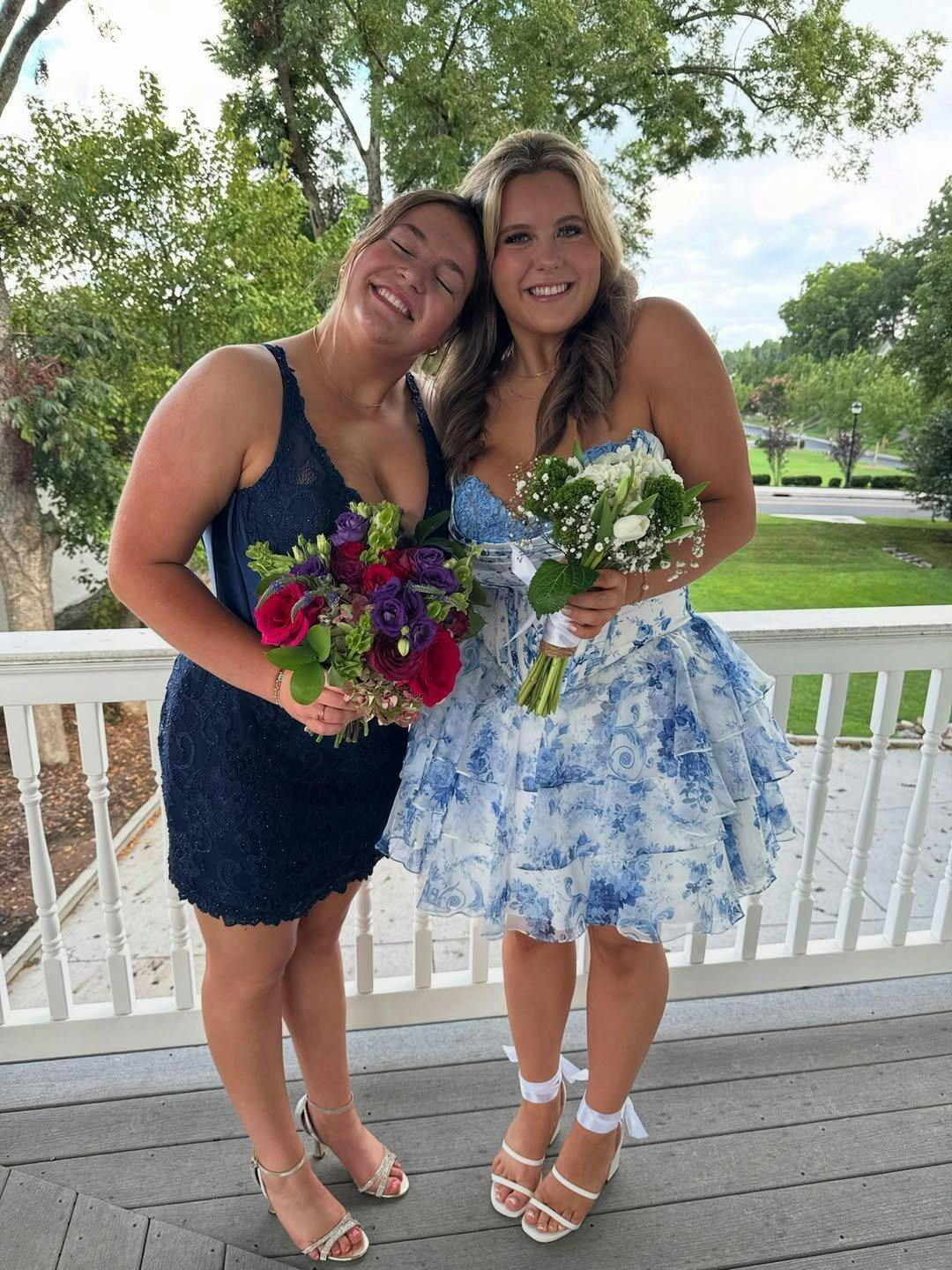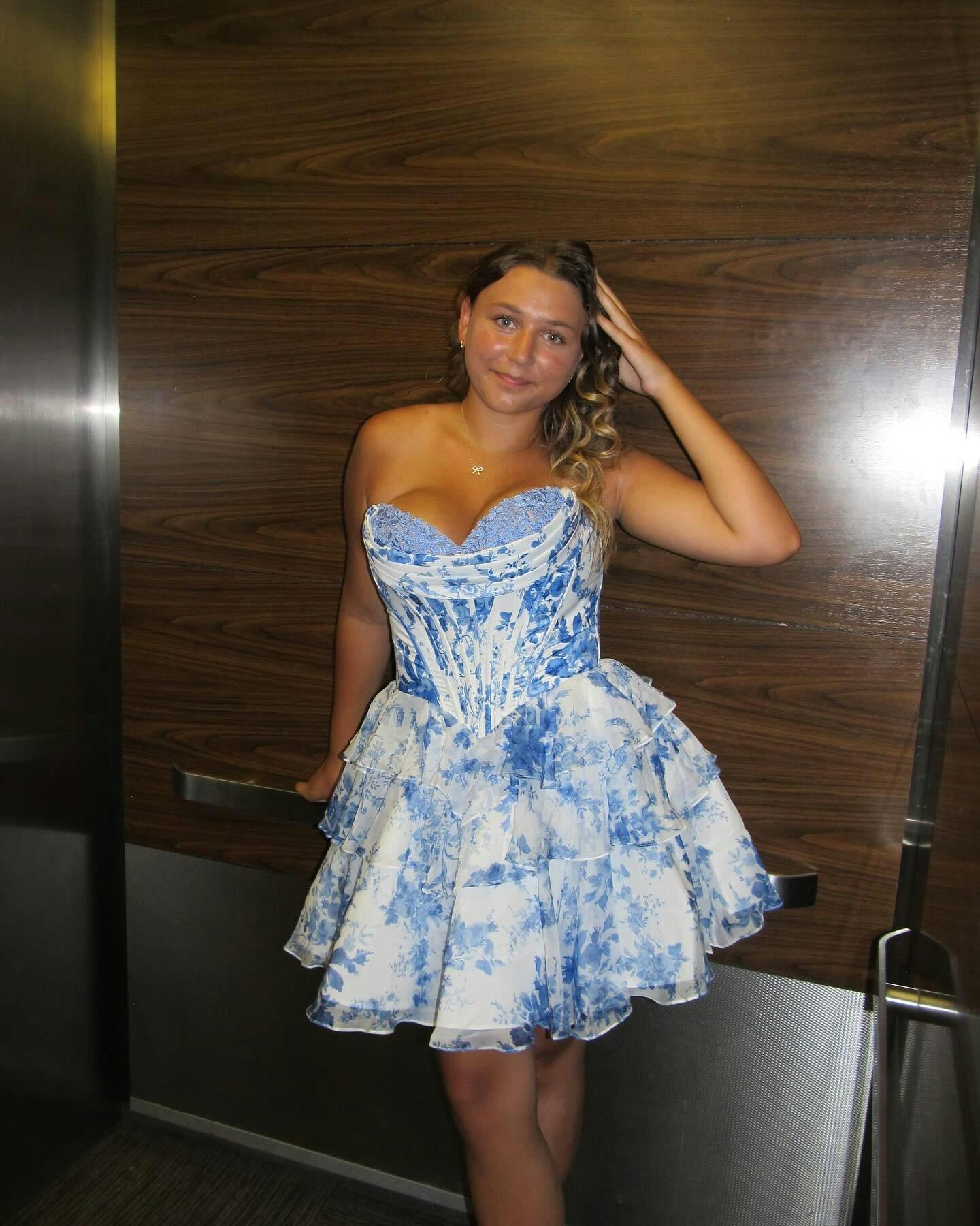 Gorgeous A Line Sweetheart Blue Printed Short Homecoming Dress with Ruffles