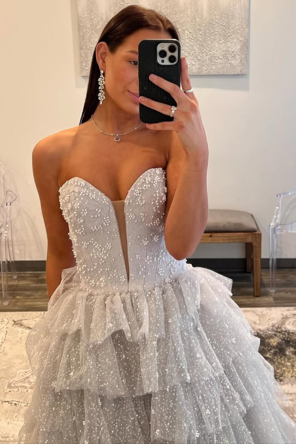 Gorgeous A Line Sweetheart Silver Long Prom Dress with Pearls Ruffles