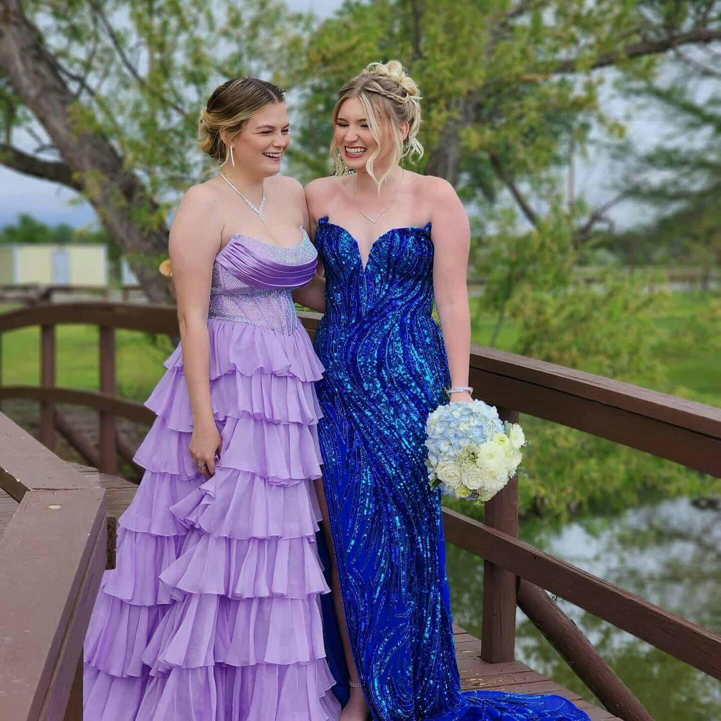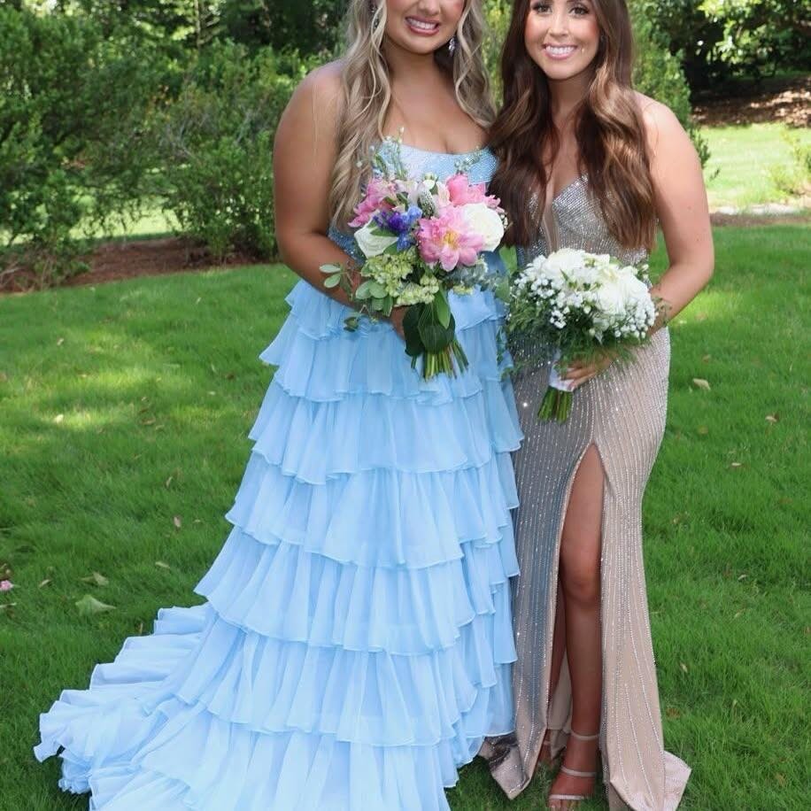 Gorgeous Royal Blue A-Line Sparkly Long Layered Chiffon Prom Dress With Slit