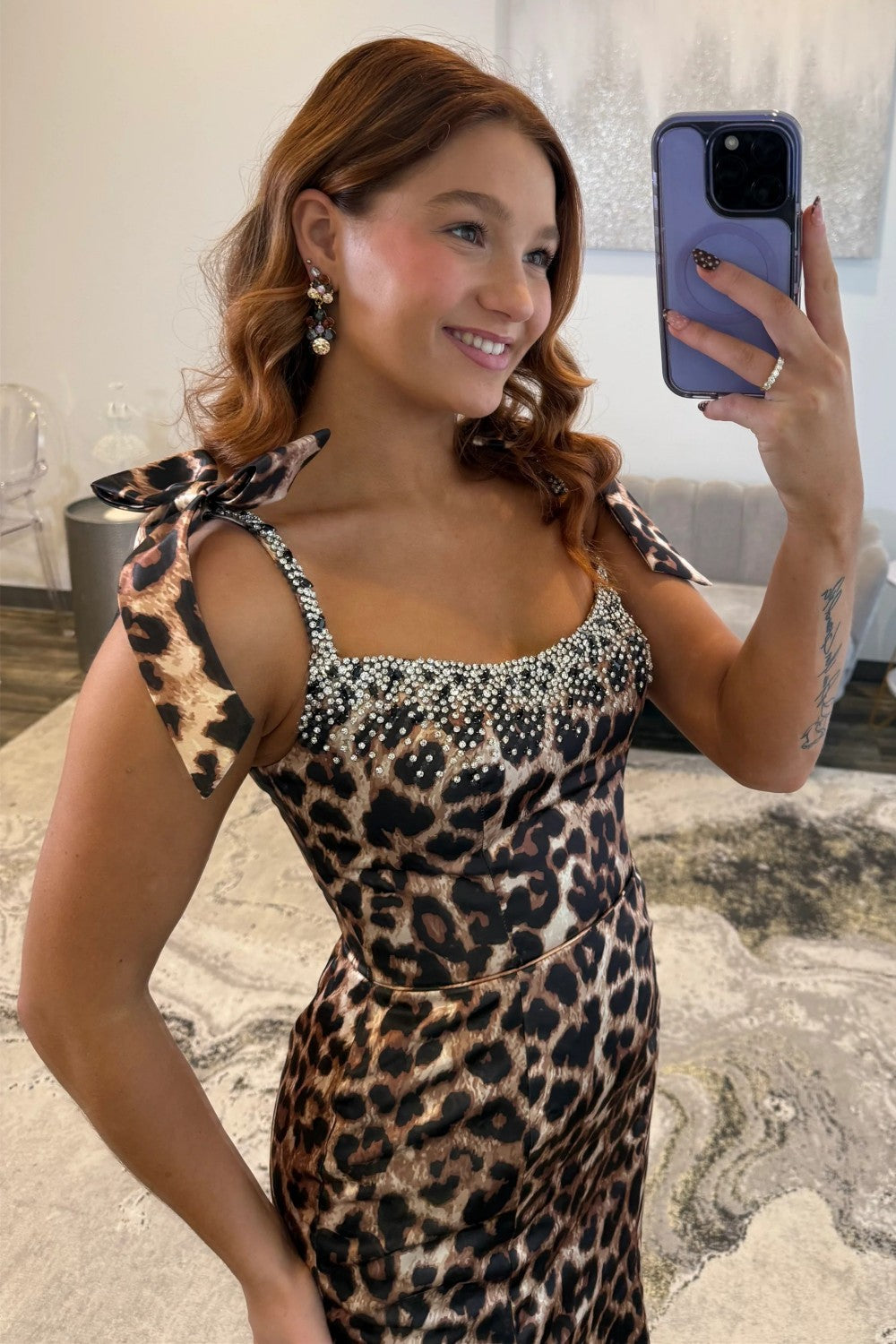 Hot Mermaid Spaghetti Straps Brown Leopard Printed Long Prom Dress with Beading