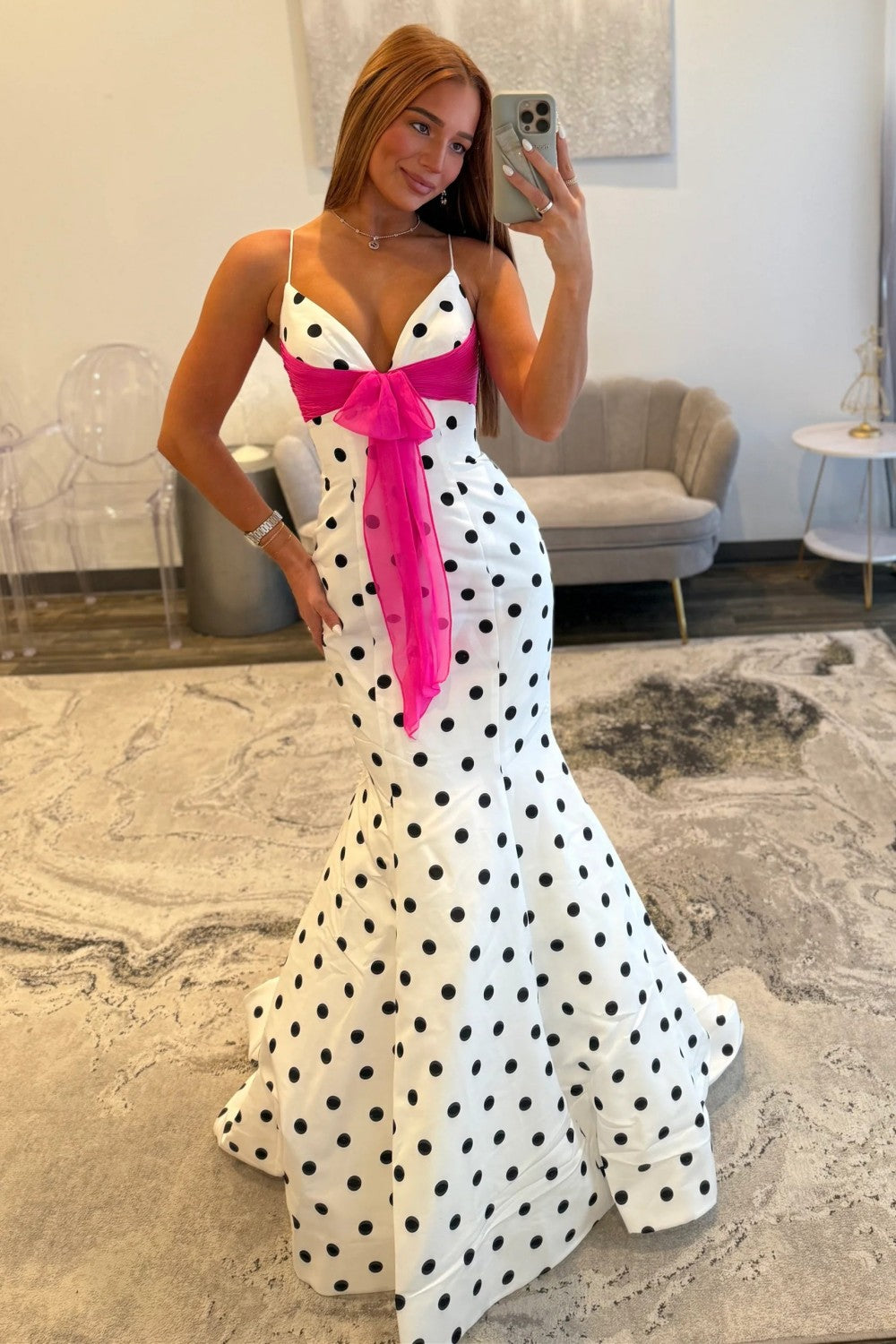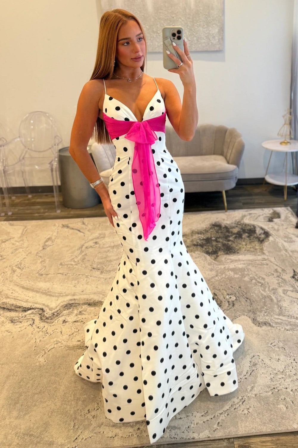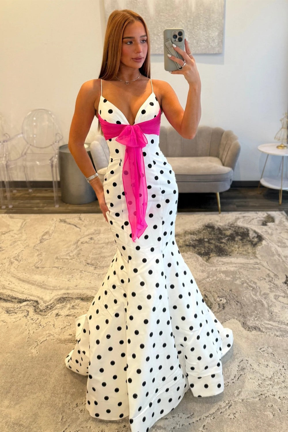 Pretty Mermaid Spaghetti Straps White Polka Dots Long Prom Dress with Bowknot