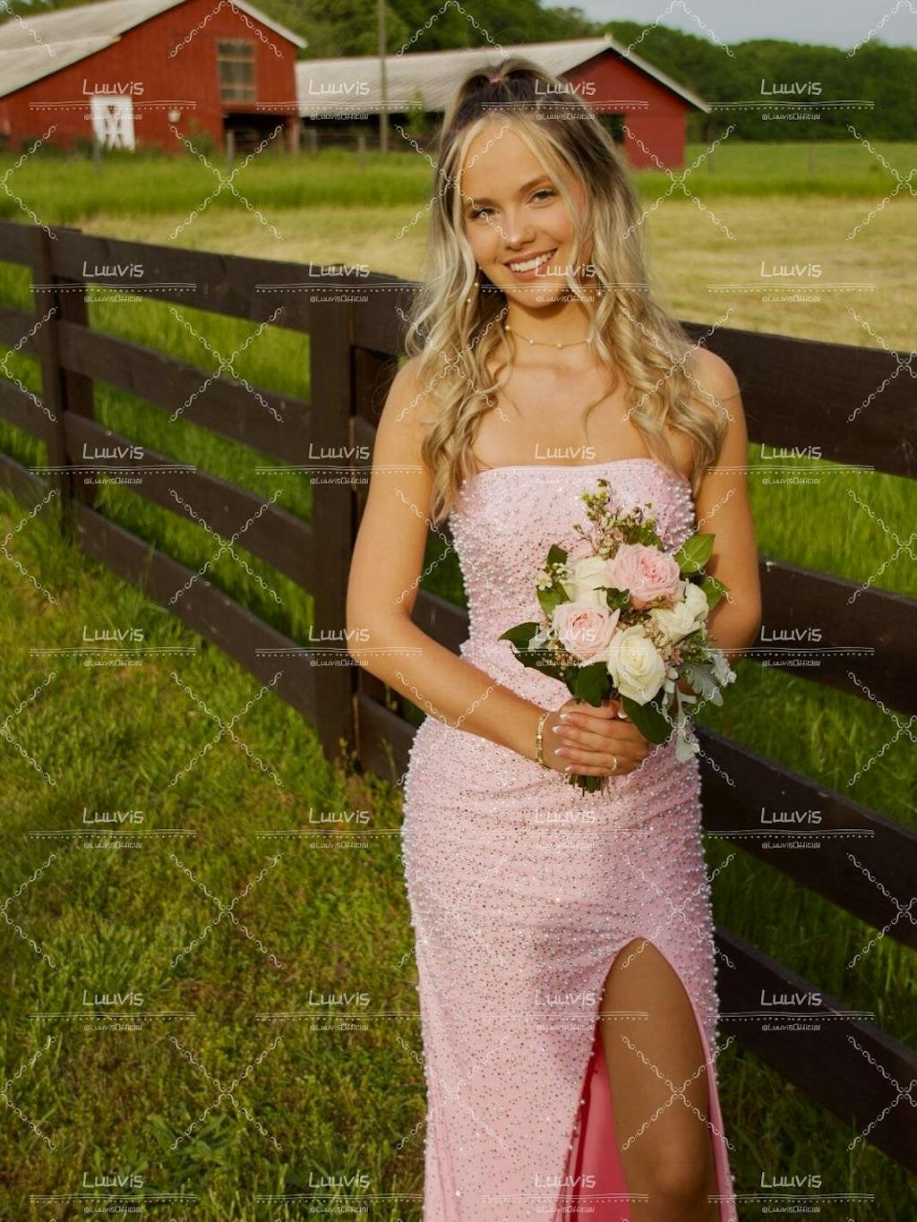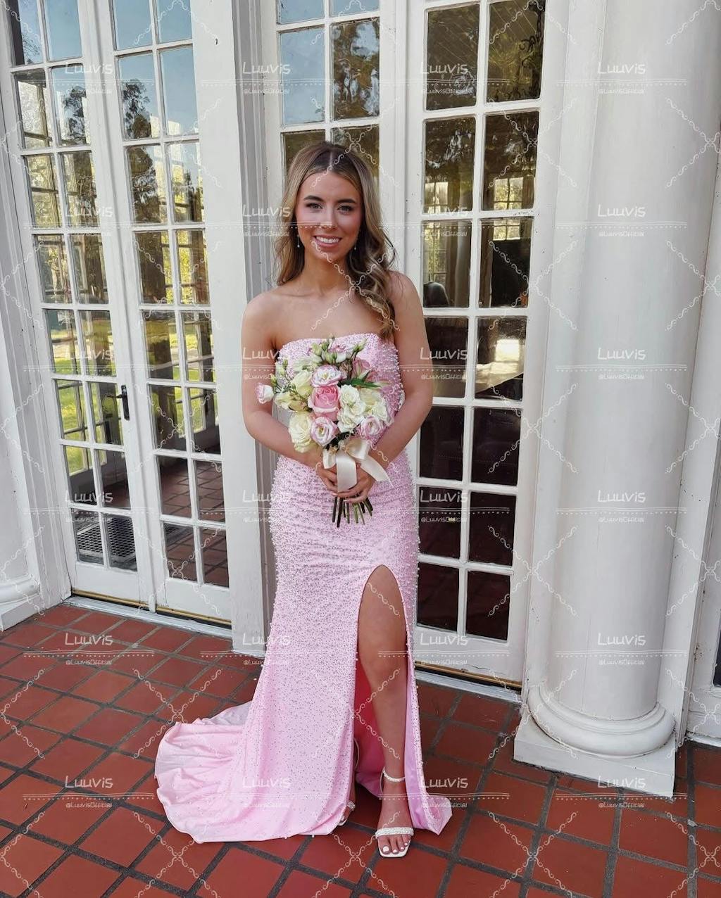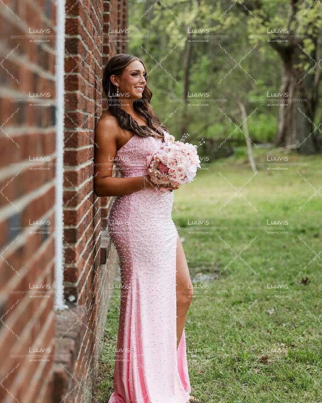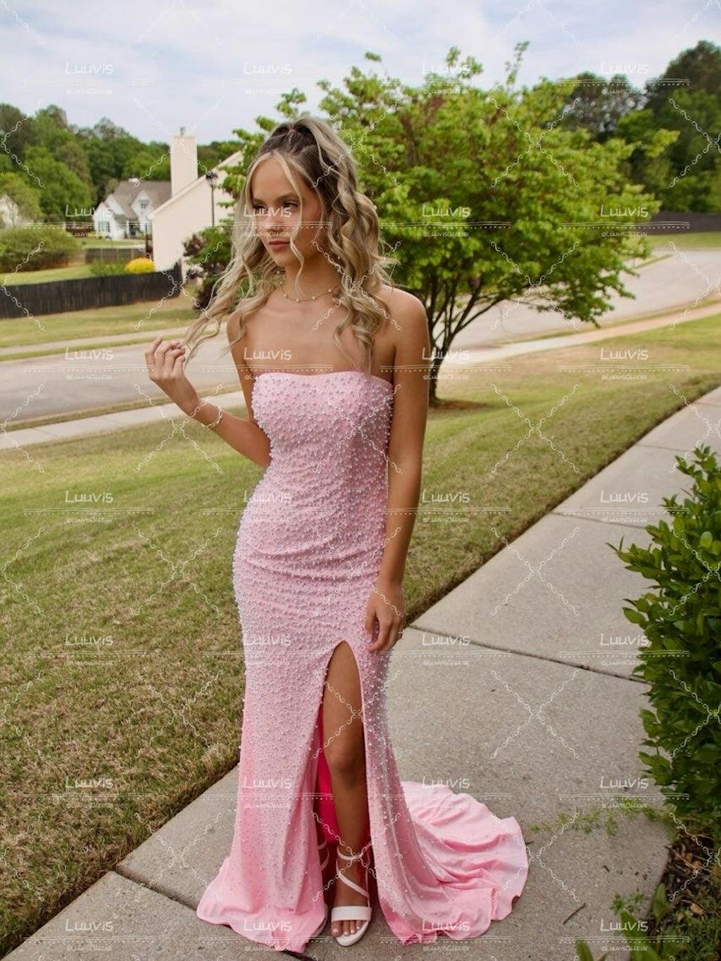 Pretty Mermaid Strapless Pink Long Prom Dress with Pearls