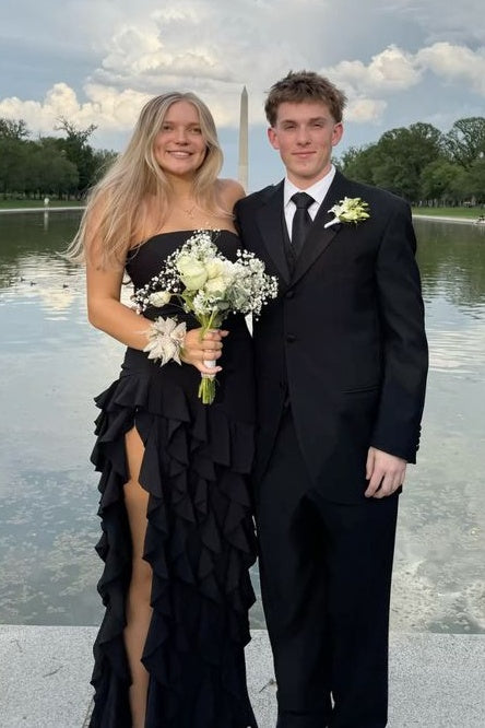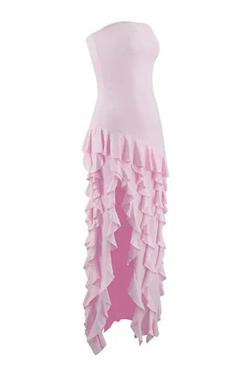 Pretty Sheath Strapless Pink Long Party Dress with Ruffles Split Front