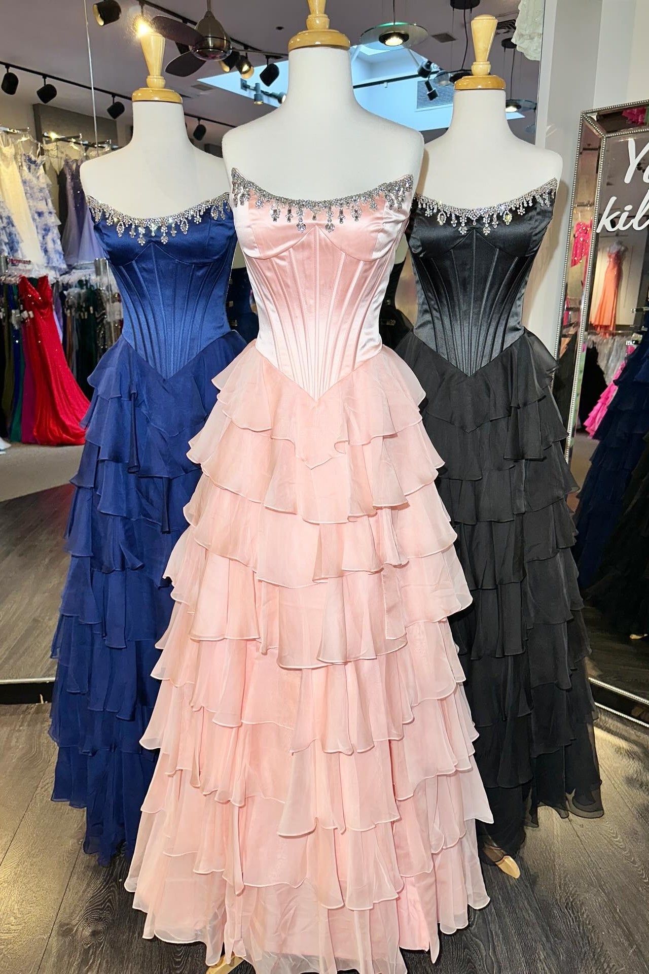 Princess A Line Strapless Hot Pink Corset Prom Dress with Beading Ruffles