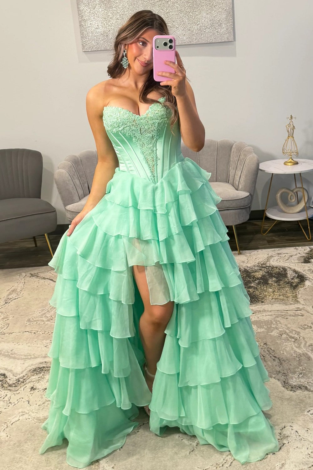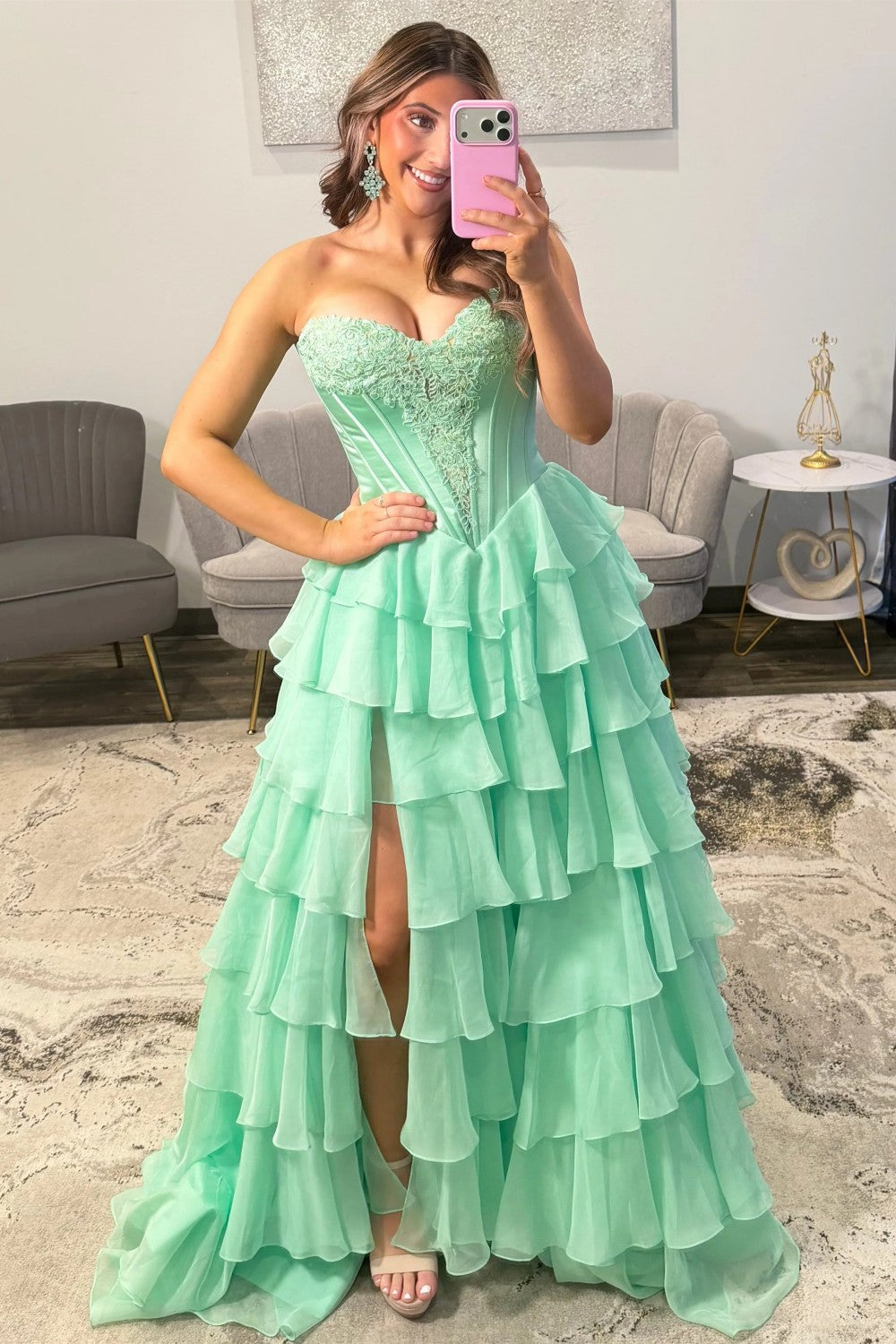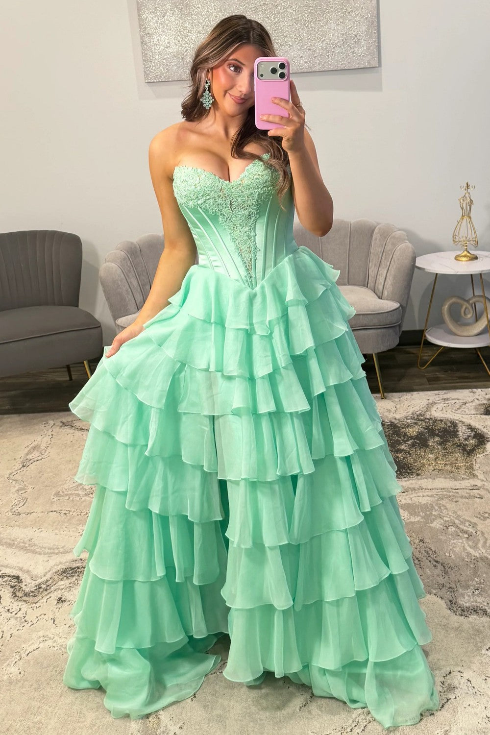 Princess A Line Sweetheart Green Corset Prom Dress with Appliques Ruffles