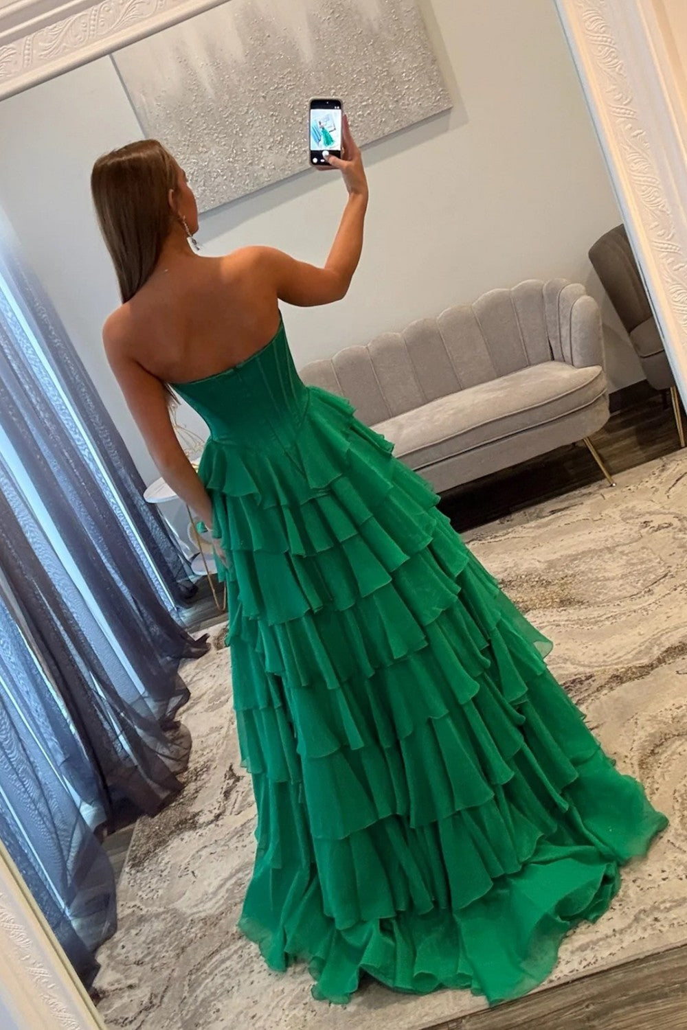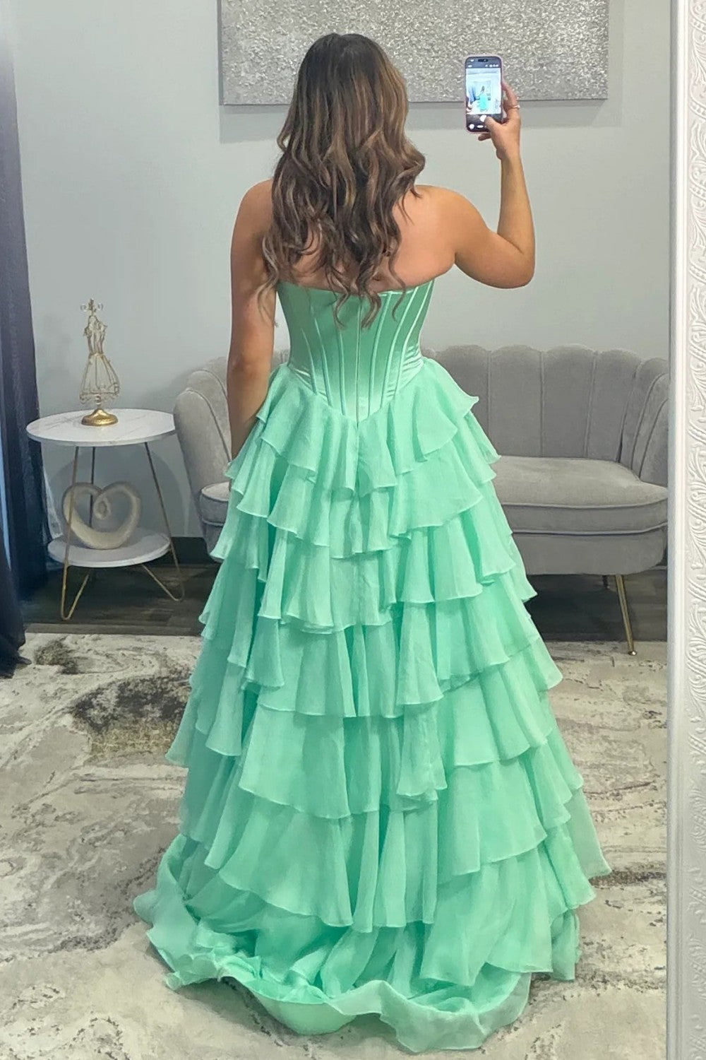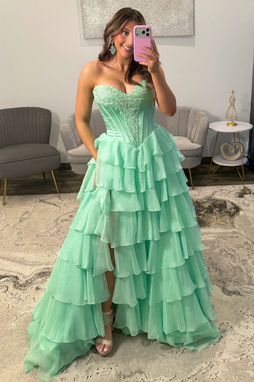 Princess A Line Sweetheart Green Corset Prom Dress with Appliques Ruffles