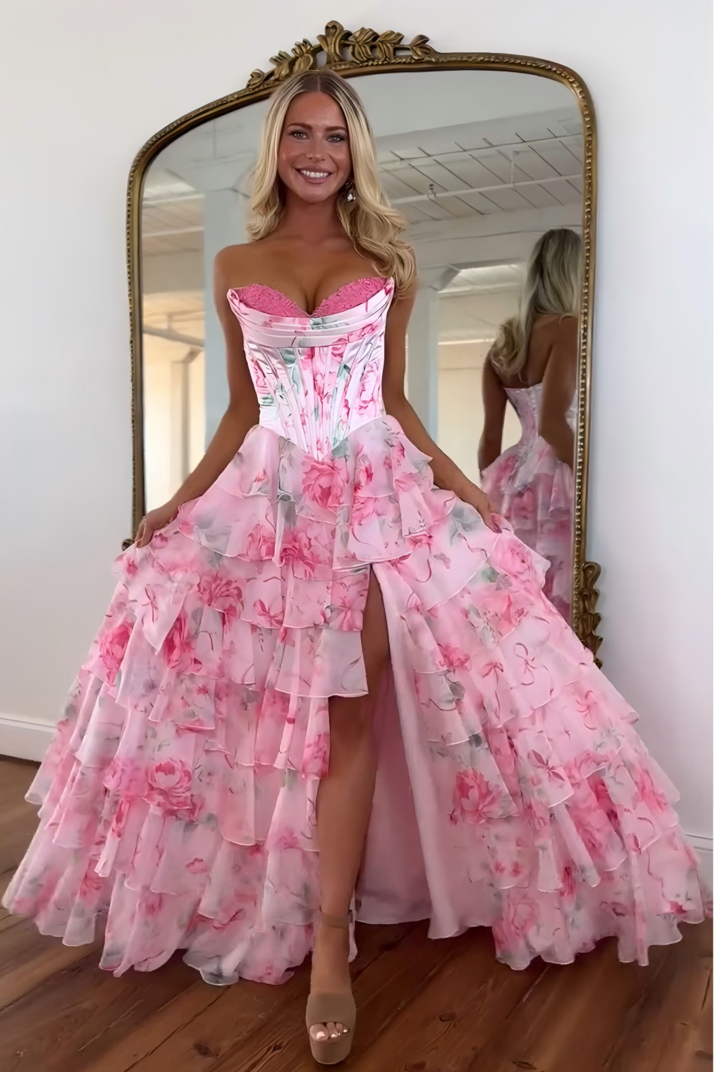 Princess A Line Sweetheart Pink Corset Prom Dress with Ruffles