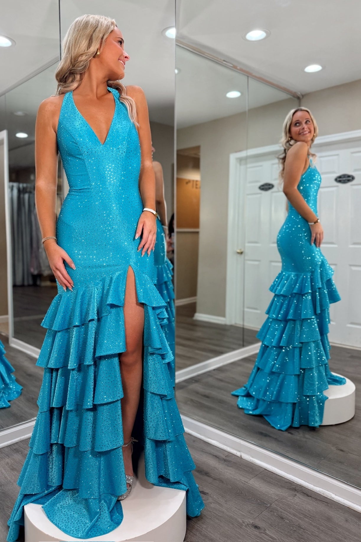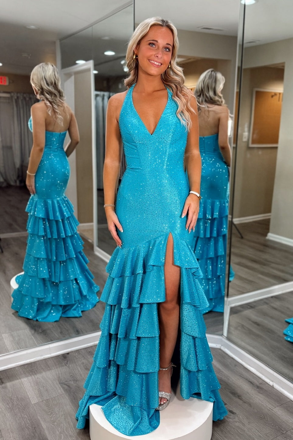 Sparkly Mermaid Halter Neck Blue Long Prom Dress with Beading Ruffles
