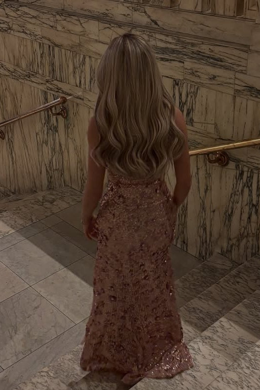 Sparkly Sheath Strapless Rose Pink Sequins Long Prom Dress with Slit