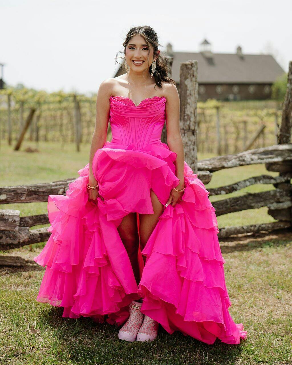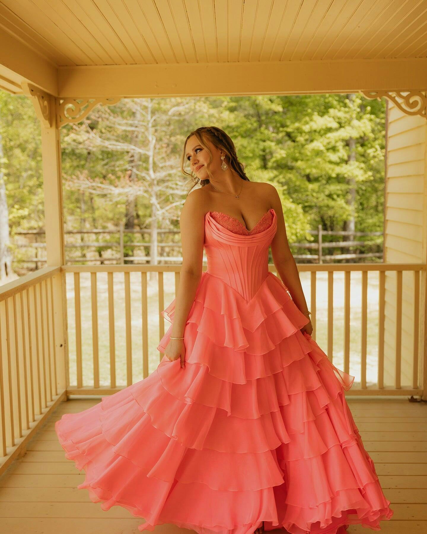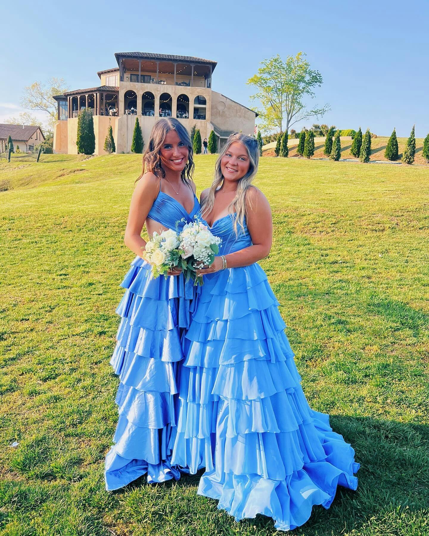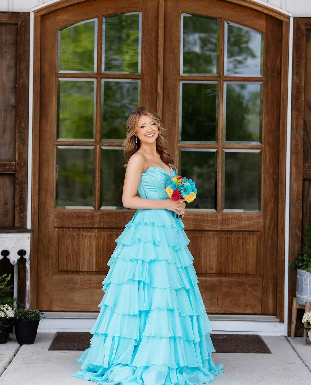 Stunning A-Line Sweetheart Satin Top Long Tiered Chiffon Prom Dress with Slit