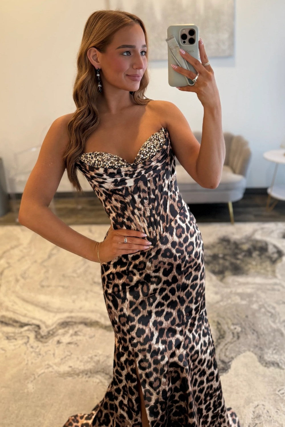 Stunning Mermaid Sweetheart Brown Leopard Printed Corset Prom Dress with Beading