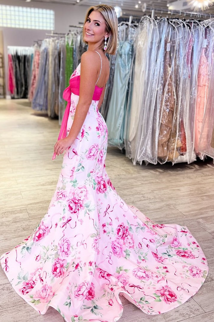 Sweety Mermaid Spaghetti Straps Pink Floral Printed Long Prom Dress with Bowknot