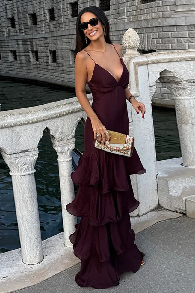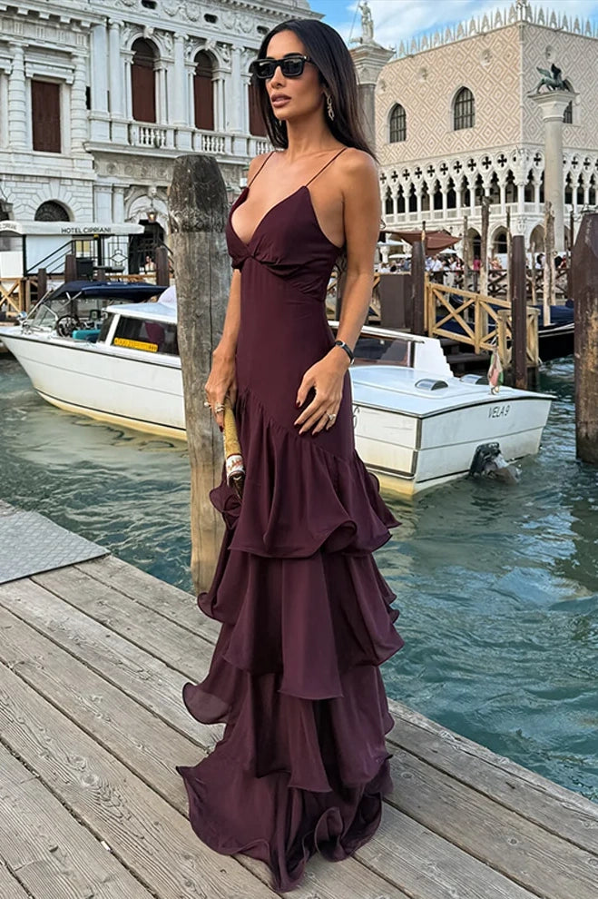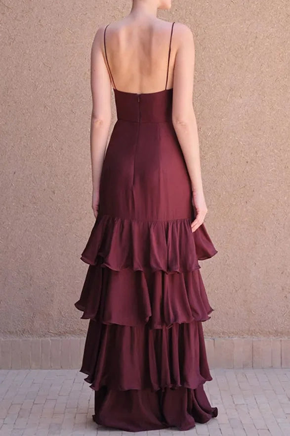 Trendy A Line Spaghetti Straps Burgundy Long Prom Dress with Ruffles